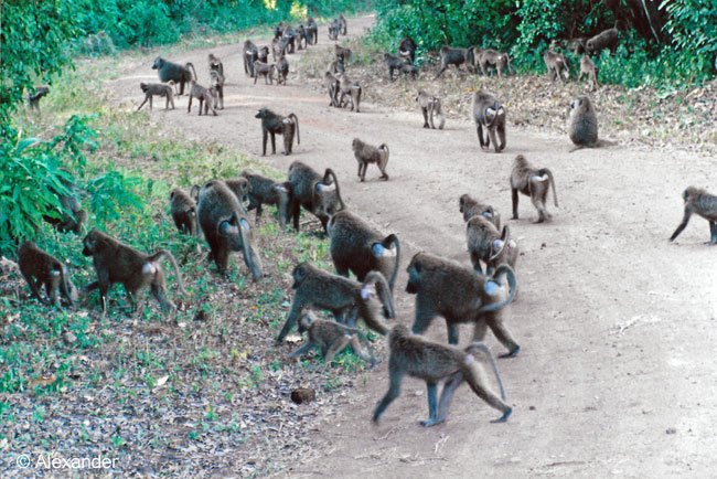 Baboons are one of the easier Old World monkeys to spot not only because of their larger size, but also because they travel in large troops. There were many instances when the safari vehicle rounded a corner to find a troop of 50 or 100 baboons walking their daily route.