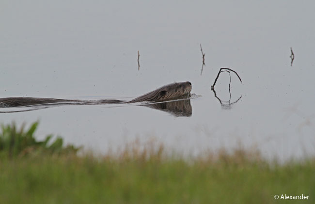 In January I went to a flooded agricultural field to observe ducks and cranes. At one point there was a curious underwater movement…unidentifiable. We waited, and watched. And a river otter popped out!